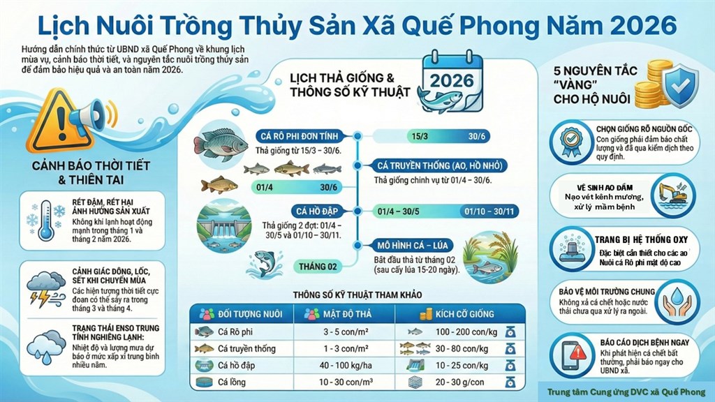 UBND xã Quế Phong thông báo đến các hộ dân và cơ sở nuôi trồng thủy sản trên địa bàn về khung lịch mùa vụ nuôi trồng thủy sản năm 2026, nhằm chủ động...